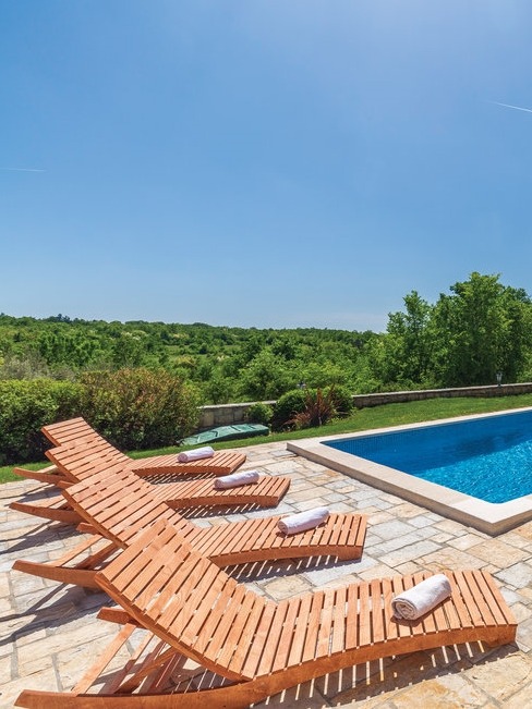 Na terasi je bazen okružen udobnim ležaljkama. Ovdje možete uživati u sunčevim zrakama i osvježiti se u bazenu kad god poželite. Bazen je savršeno mjesto za opuštanje s obitelji ili prijateljima.
